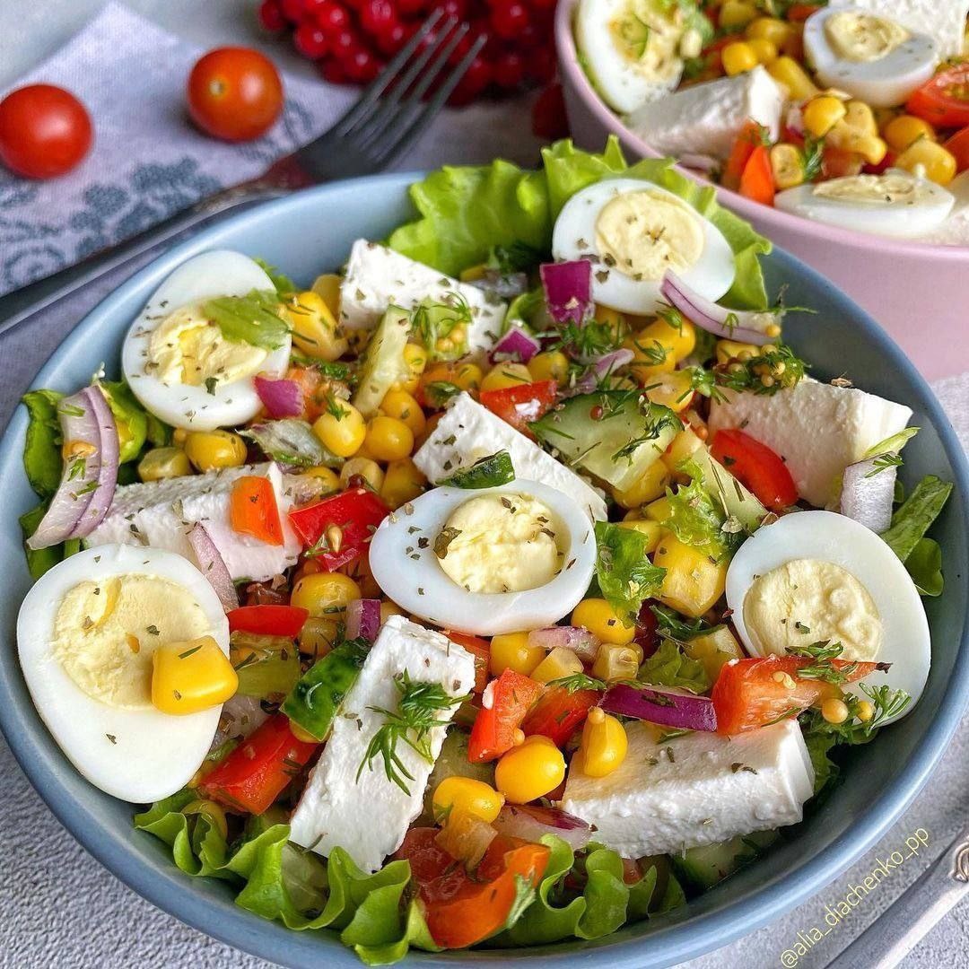 САЛАТ С ФЕТОЙ И КУКУРУЗОЙ ✅КБЖУ порции = 388,9/17,7/24,9/23,5 Ингредиенты: ▫️Фета 75 грамм ▫️Перепелиные яйца 3 шт. ▫️Кукуруза 75 грамм ▫️Красный лук, листья салата, огурец, перец, черри, укроп 150 грамм ▫️Оливковое масло 5 мл ▫️Зернистая горчица 5 грамм ▫️Прованские травы Приготовление: ▫️Очень легкий в приготовлении салат. Отварить перепелиные яйца. Помыть овощи. Нарезать все ингредиенты, соединить, заправить заправкой, посыпать травами. Приятного аппетита! #рецепты ПП И ПОХУДЕТЬ