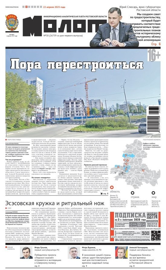 ☕Читайте в «Молоте»: 🔺Пора перестроиться 30 июня завершится полугодовая пауза на выдачу разрешений на строительство многоквартирных домов в донской столице, сообщил журналистам глава региона Юрий Слюсарь. Новые правила игры он обсудил с застройщиками на отраслевом форуме. Что решили? Читайте у Елены Бондаренко. 🔺«Робот, подайте скальпель!» Серию передовых роботизированных устройств разрабатывают преподаватели и студенты новочеркасского политеха — Южно-Российского государственного политехнического университета им. Платова. Среди них — мехатронная система перекладывания, которой под силу аккуратно поднять парализованного или малоподвижного пациента и переложить с кровати на операционный стол. Подробности — у Виктории Головко. 🔺Также в номере: политическая рубрика «Акценты» от Александра Оленева, анонс культурных событий в городах и районах области и новости спорта. 📰Читайте «Молот», у нас надежные источники! Оформляйте подписку в отделениях Почты России и на сайте Don24.ru.