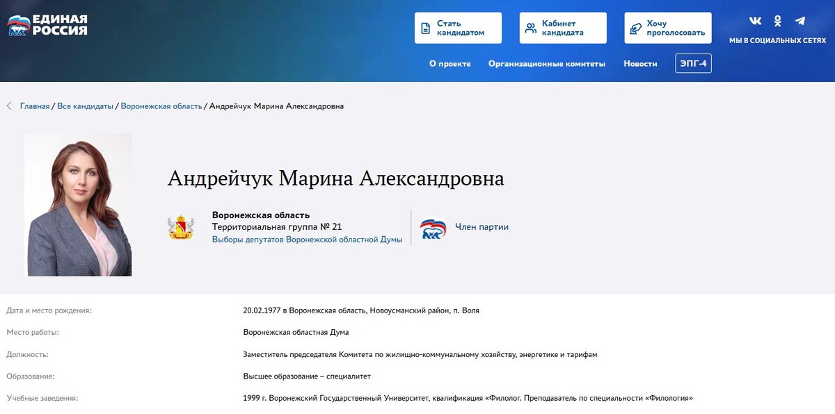 На праймериз «Единой России» выдвинулись два действующих депутата Воронежской облдумы Марина Андрейчук и Ольга Ортина. Можно сказать, что они являются настоящим украшением ЗакСа. Это – две красотки, которые поражают окружающих своим имением одеваться со вкусом и великолепно держаться на людях. Как мы сказали, в областную Думу депутаты впервые попали в 2020 году, и теперь они решили туда переизбраться. Марина Андрейчук идет на предварительное голосование «Единой России» в территориальной группе №21. Она родилась 20 февраля 1977 года в поселке Воля Новоусманского района. В 1999 году закончила ВГУ. Затем работала менеджером отдела продаж, по связям с общественностью и по рекламе в ООО «Мебель Черноземья», универмаге «Россия», ООО «Амфитрион» и ООО «Велюр». В середине «нулевых» годов Марина Александровна стала управляющим директором Ассоциации «Галерея Чижова». В этой структуре она работала на руководящих постах больше 10 лет. В 2015 году Андрейчук устроилась в мэрию Воронежа. В том же год