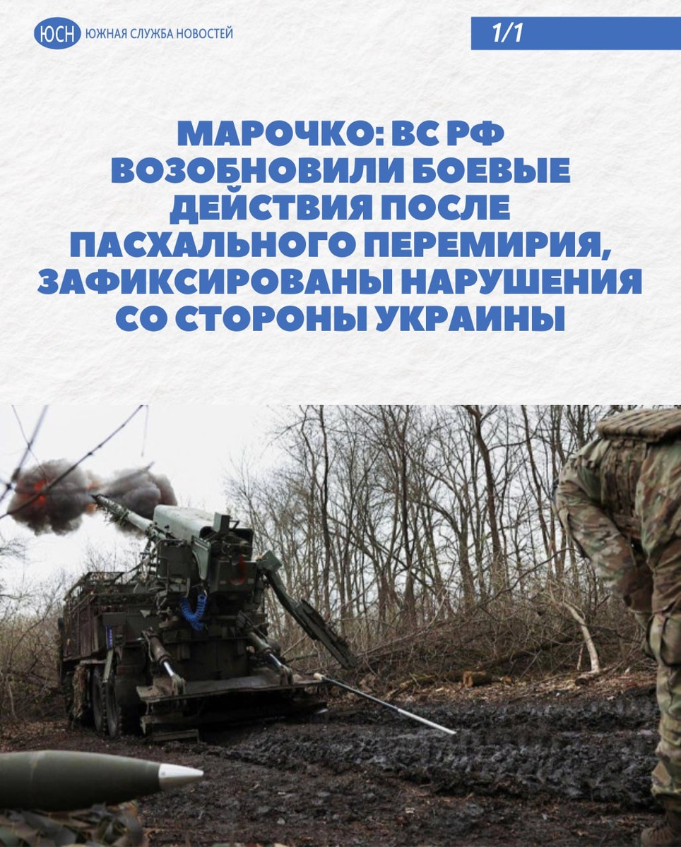 🔹Марочко: ВС РФ возобновили боевые действия после пасхального перемирия, зафиксированы нарушения со стороны Украины