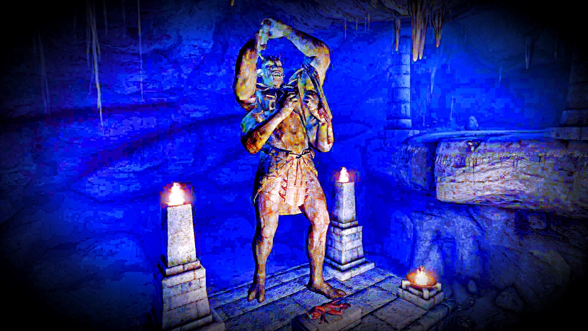 Спустившись к статуе, я обнаружил на алтаре почти голого аргонианина. Так, они тут ещё и жертвы Дагону приносят?