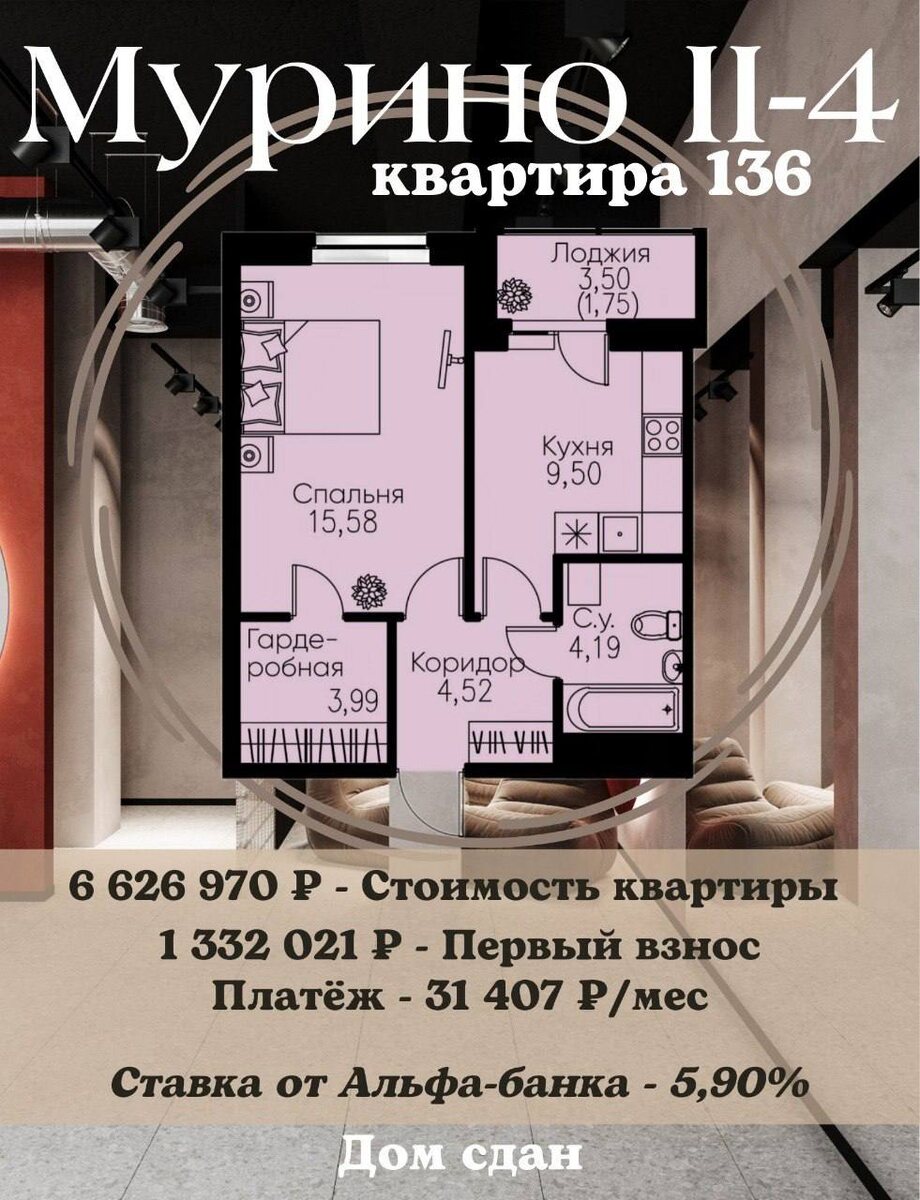 Семейная ипотека с Альфа-банком 👍 😍iD Murino II, к.4, однокомнатная квартира №136 (39.53 м²) Условия ипотеки: ⭐️Программа: Семейная ипотека ⭐️Банк: Альфа-банк ⭐️Субсид. ставка: 5,90% ⭐️Первый взнос от 20,1% Жду ваши заявки!☺️ По всем вопросам звоните : +79667578789 Михаил