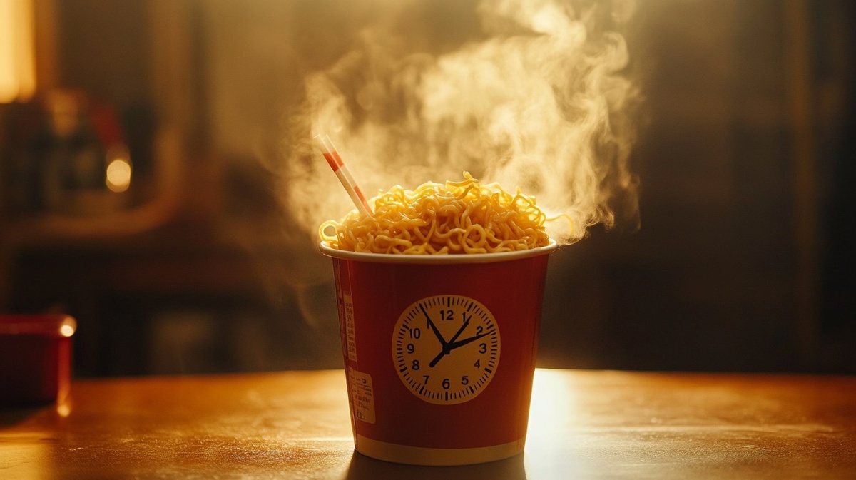 Создано на основе запроса: A steaming cup of instant noodles on a table, clock showing exactly 3 minutes, close-up, dramatic lighting