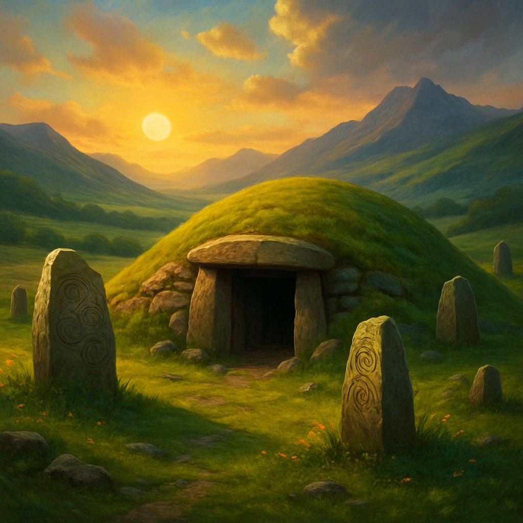 Пастух видел женскую фигуру на холме Newgrange; через семь дней буря смела ферму. Местные шепчут: «это богиня Боинь: она напоминает, что курган не декорация».