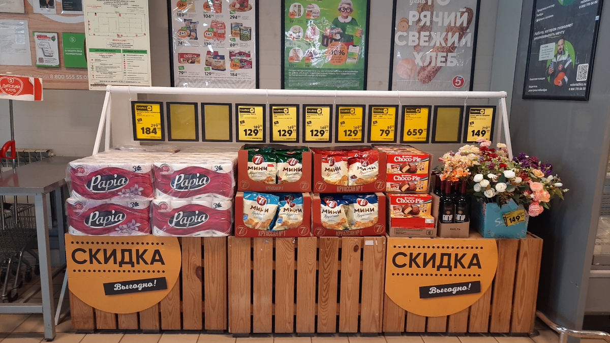 Всех приветствую, в Пятерочке началась новая неделя скидок, покажу вам витрину с товарами со скидкой и товары у кассы. Магазин находится по адресу Ростовская область, Зерноградский район, станица Мечётинская, улица Ленина 62 Туалетная бумага PAPIA 3х-слойная 8 рулонов в ассортименте цена со скидкой по карте 184.90 руб. Круассаны 7DAYS 265 г в ассортименте цена со скидкой по карте 129.99 руб. Кондитерское изделие мучное Орион Чоко-Пай 180 г цена со скидкой по карте 79.99 руб. Букет искусственных цветов Seasons пионы цена со скидкой по карте 149.99 руб. Вино Кагор Монастырский Амулет крепленое красное десертное 16 % 0.75 мл цена со скидкой по карте 659.99 руб. Сыр Брест Литовск классический 200 г 45% цена со скидкой по карте 189.99 руб. Майонез Провансаль Слобода 67 % 400 мл цена со скидкой по карте 104.99 руб. Сосиски молочные Папа Может 410 г цена со скидкой по карте 129.99 руб. Сыр плавленый Свежий ряд Янтарь 45 % 400 г цена со скидкой по карте 239.99 руб. Колбаса Вязанка докт