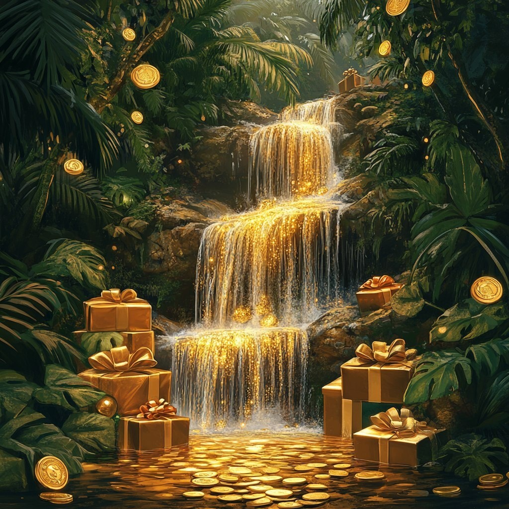 Создано на основе запроса: a beautiful natural and lush waterfall with golden water flowing and full of golden presents and coins
