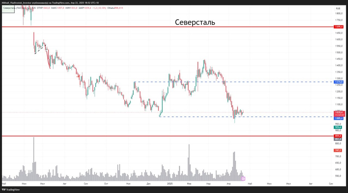 ❌⛰#CHMF #дивиденд $CHMF СД СЕВЕРСТАЛЬ: ДИВИДЕНДЫ 1КВ 2025Г = НЕ ВЫПЛАЧИВАТЬ ГОСА - 6 июня #отчетность FCF СЕВЕРСТАЛИ В I КВАРТАЛЕ СОСТАВИЛ ОТРИЦАТЕЛЬНЫЕ 32,7 МЛРД РУБ. Компания «Северсталь» в 1 квартале 2025 года увеличила продажи металлопродукции на 7% г/г до 2 657 тыс. тонн. Тем не менее, выручка сократилась на 5% г/г до 178 733 млн рублей на фоне снижения средних цен реализации. Показатель EBITDA снизился на 40% г/г до 39 363 млн руб. вслед за выручкой. Рентабельность по EBITDA составила 22% (-13 п.п. г/г). отчет Потребление металла в РФ в 1кв 2025г упало на 13% - "Северсталь" По графику: 1000 сильная поддержка. Но при этом спроса нет совсем в моменте. Если и рассматривать покупки, то только инвестиционные. А так картинка конечно шортовая.