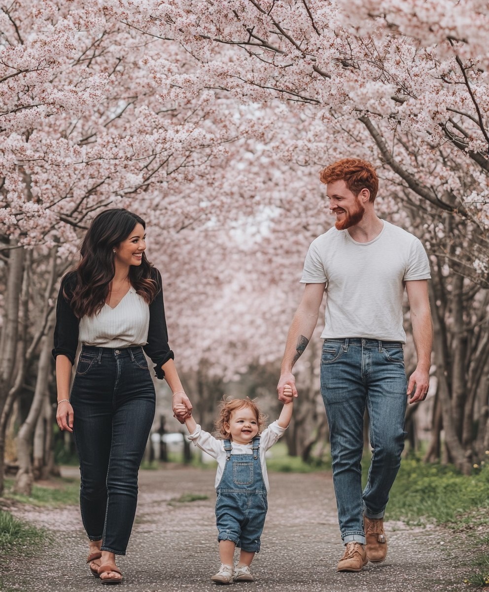 Создано на основе запроса: A family photo of an attractive young couple with their toddler, walking hand in hand under blooming cherry blossom trees. The woman has dark hair and is wearing black jeans and white top. She wears blue overalls on her legs. Her husband stands next to them, he's red-haired, short beard stubble, muscular build, dressed casually but well styled for the weather. He smiles at his child who walks beside him happily. Shot by Nikon D850 DSLR camera with an 24-70mm f/36 lens , ultra detailed --- Автоперевод: Семейное фото привлекательной молодой пары со своим малышом, идящейся рука об руку под цветущей вишневой цветом деревьев. Хорошо получилось? 🤔 https://dzen.ru/id/65c0c65c86e4f837c27b24d7 #ИИ #AI #нейросеть #midjourney #art