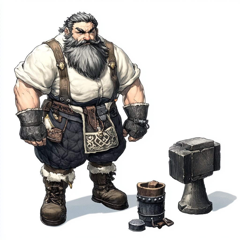 Создано на основе запроса: Fantasy concept illustration, Male, Dwarf, Thick gray beard, Pot nose, Rosy cheeks, Blacksmith, Anvil, Hammer