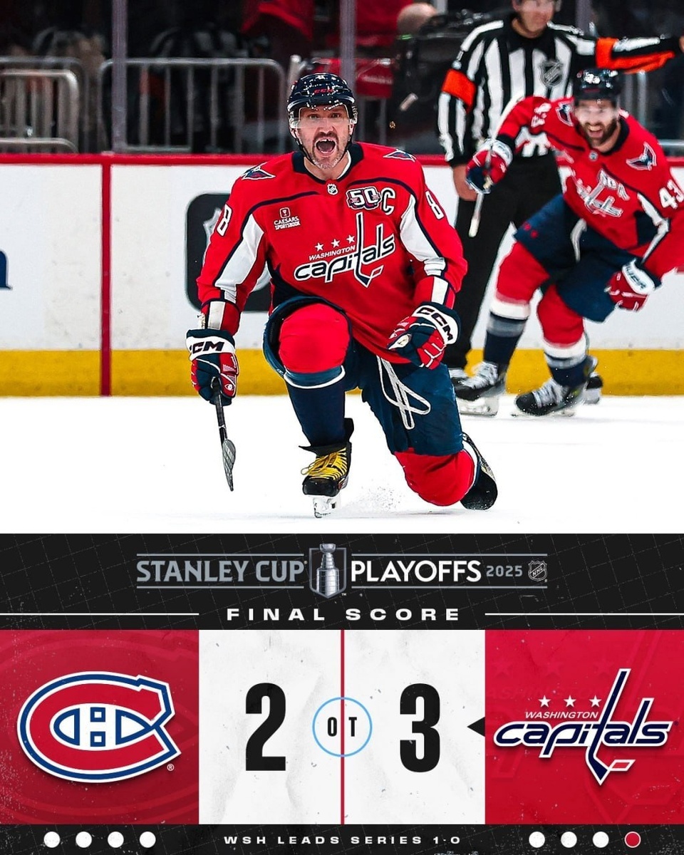🦅 «Вашингтон» начал плей-офф с победы над «Монреалем» (3:2 ОТ). Овечкин с дублем и результативной передачей стал первой звездой матча 💪