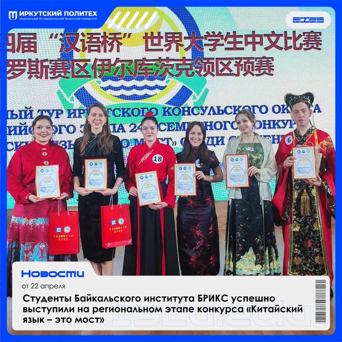 Актуальная подборка новостей ИРНИТУ за 22 апреля! 🌥 Студенты Байкальского института БРИКС успешно выступили на региональном этапе конкурса «Китайский язык – это мост» 🌥 Конкурс школьных работ «Юность. Проект. Перспектива» 🌥 «Неделя без турникетов» в ИРНИТУ: погружение школьников в инженерные профессии 🌥 Конференцию ИРНИТУ «Технологическое предпринимательство» поддержал Банк ВТБ 🌥 Политеховцы Георгий Шаламов и Светлана Иванова выиграли международный конкурс «Новаторский подход» Листайте карточки!