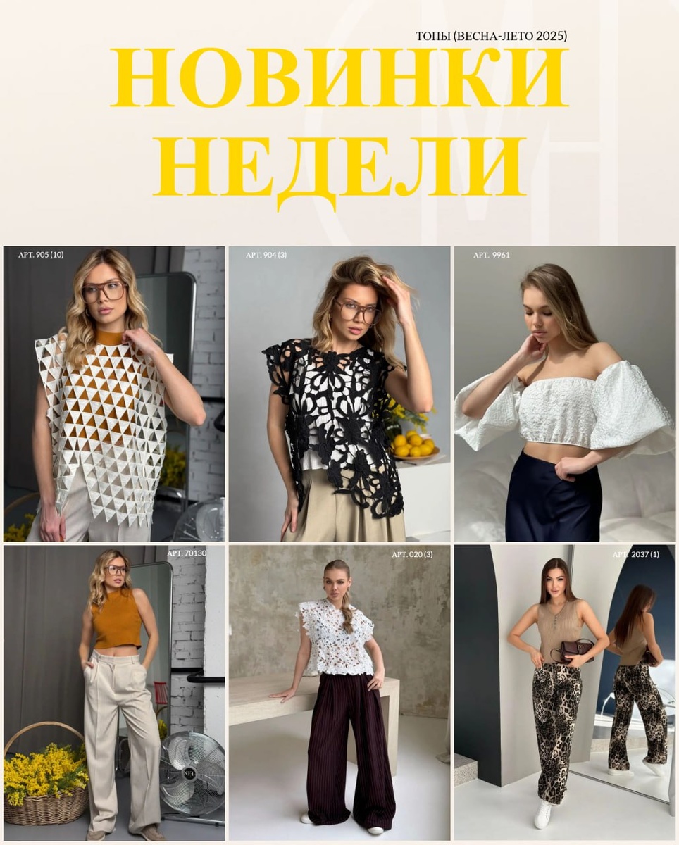 🌱 Топы — must-have весенне-летнего сезона для магазина одежды Легкие, дышащие и невероятно универсальные топы — основа летнего гардероба. В жару их выбирают за комфорт и возможность создавать десятки образов: сочетать с шортами, юбками-миди, джинсами или под пиджаки ❗️Акцент на многослойность: 👉 предложите клиентам комбинации с oversize-рубашками или шелковыми платками. Топы работают и на молодую аудиторию, и на женщин 30+ — главное правильно зонировать ассортимент. Новинки этой недели 👇 905 (10) | Цена: 710 Р. 904 (3) | Цена: 670 Р. 9961 | Цена: 640 Р. 70130 | Цена: 230 Р. 020 (3) | Цена: 530 Р. 2037 (1) | Цена: 650 Р. *За обновлениями ассортимента следите на сайте mazurhall.ru **На фото модели одежды из ассортимента Mazur Hall. Запросите артикулы у своего ведущего менеджера или по контактам в закрепленном сообщении 🗣Mazur Hall. Подписаться!