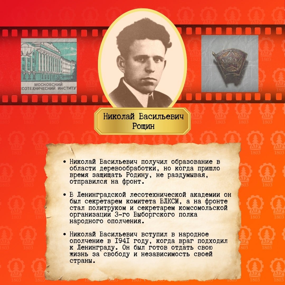 Рощин Николай Васильевич 🕊 👤 В 1931 году окончил Врасовский лесотехнический техникум по специальности «Технолог по деревообработке». В 1935 году перевёлся в Ленинградскую лесотехническую академию имени С. М. Кирова на факультет механической обработки древесины, которую окончил в 1937 году по специальности «Столярно-механическое производство». 🌲 Позже ему была присвоена квалификация технолога-механика по механической обработке древесины. Во время учёбы был секретарём комитета ВЛКСМ Ленинградской лесотехнической академии. 🎖 В 1941 году добровольно ушёл в Народное ополчение, где служил политруком и секретарём комсомольской организации 3-го Выборгского полка. Погиб в годы войны смело защищая родину. Пример его мужества вдохновляет новые поколения на преданность своему делу, любовь к Родине и готовность защищать её в трудные времена 🌟 #НаучныйПолк #НаучныйПолк2025