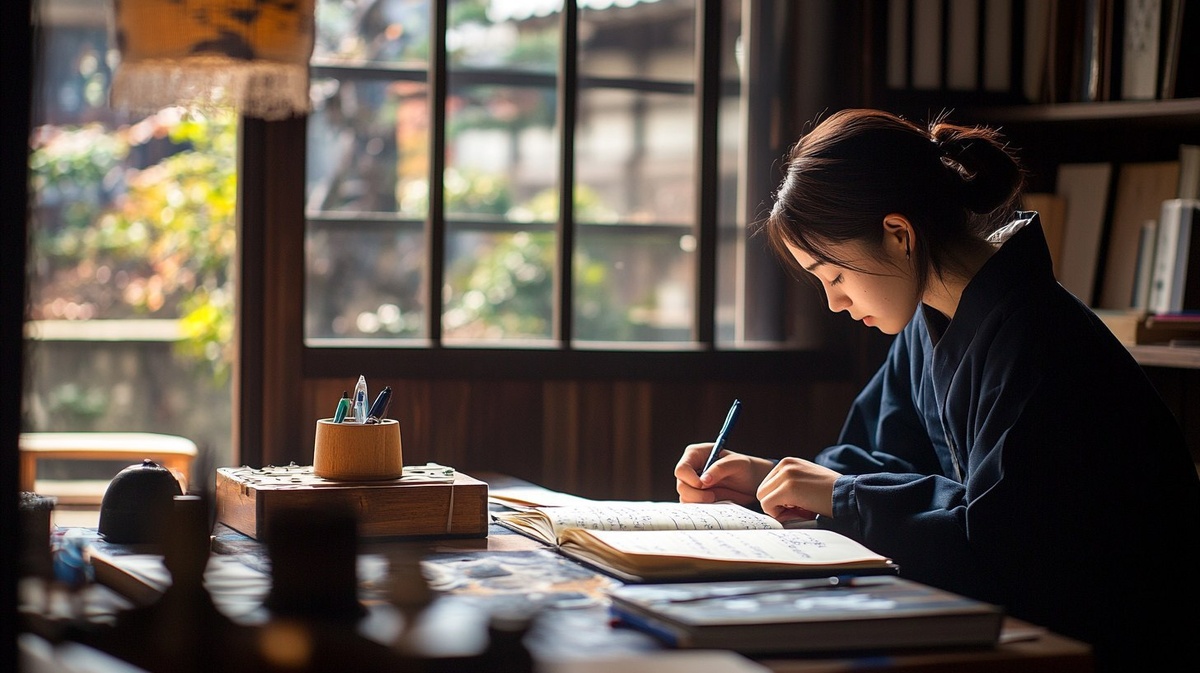 Создано на основе запроса: A focused student writing in a journal, planning career goals, minimal Japanese interior