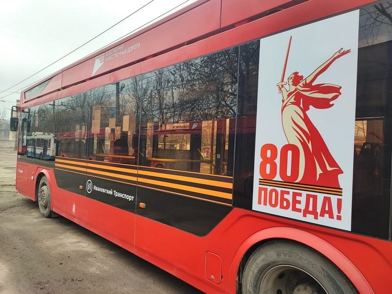 В Иванове начали украшать город к 80-летию Победы. На улицах появились троллейбусы, украшенные по бортам георгиевской лентой и плакатами. В этом году «Ивановский пассажирский транспорт» принял решение оформить весь подвижной состав.