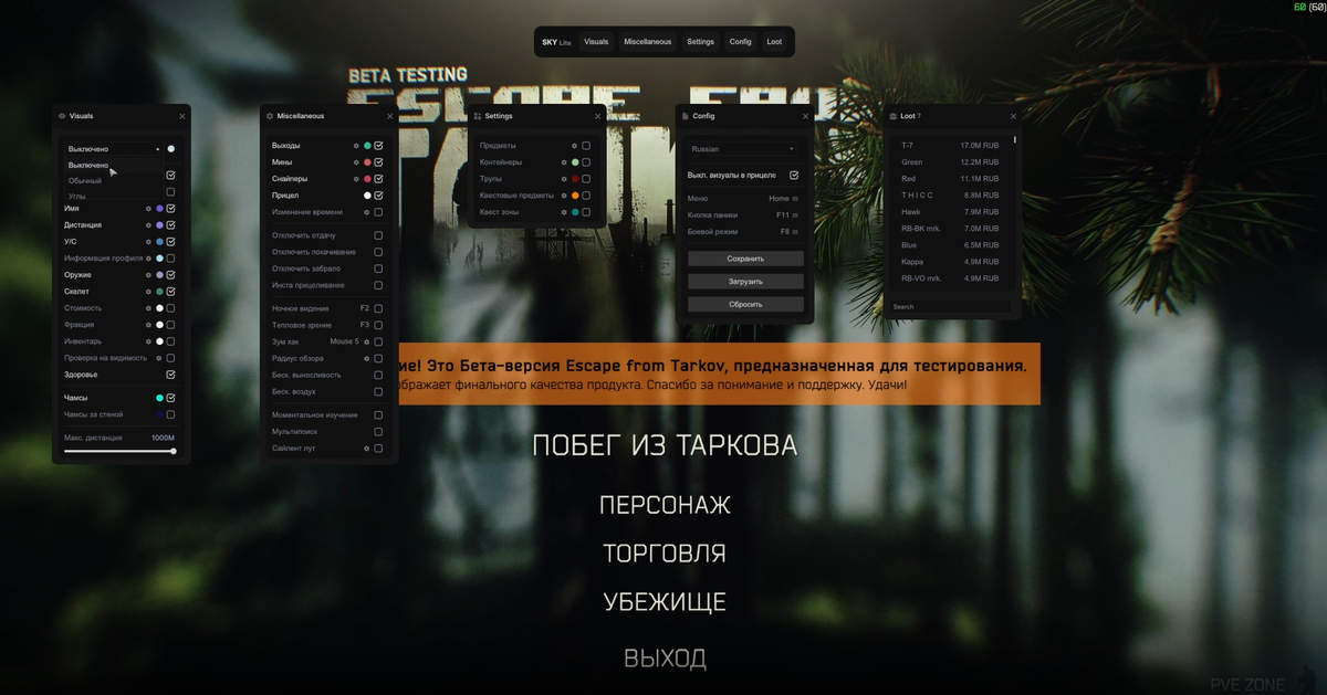 Запустив Тарков с читом Скай, я будто надел шлем с дополненной реальностью. Меню чита — как панель управления дрона: интуитивно, стильно, всё под рукой. Sky не про аимбот, а про разведку и лут — идеально для тех, кто хочет знать всё и не тратить нервы. Давай разберём, что он умеет.