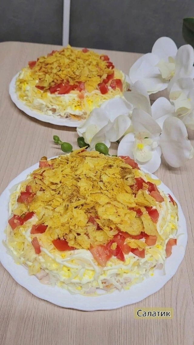 Эльвира Фатыховадан бик тәмле салат рецепты. Салат өчен әллә ниләр кирәкми, бик гади һәм телеңне йотарлык тәмле була. Тавык ите копченый суган, майонез(+чеснок) пешкән бәрәңге йомырка сыр, майонез помидор, чипсы (кириешки) Табыннарыгыз мул һәм һәрчак түгәрәк булсын