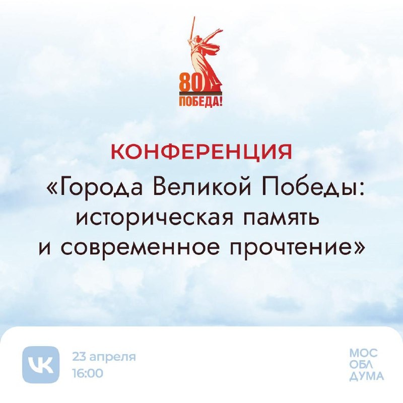 В Мособлдуме пройдёт конференция на тему: «Города Великой Победы: историческая память и современное прочтение» 🔹23 апреля, 16:00 Подробнее о мероприятии 💻 Прямая трансляция 💼 | Подписаться | Обсудить