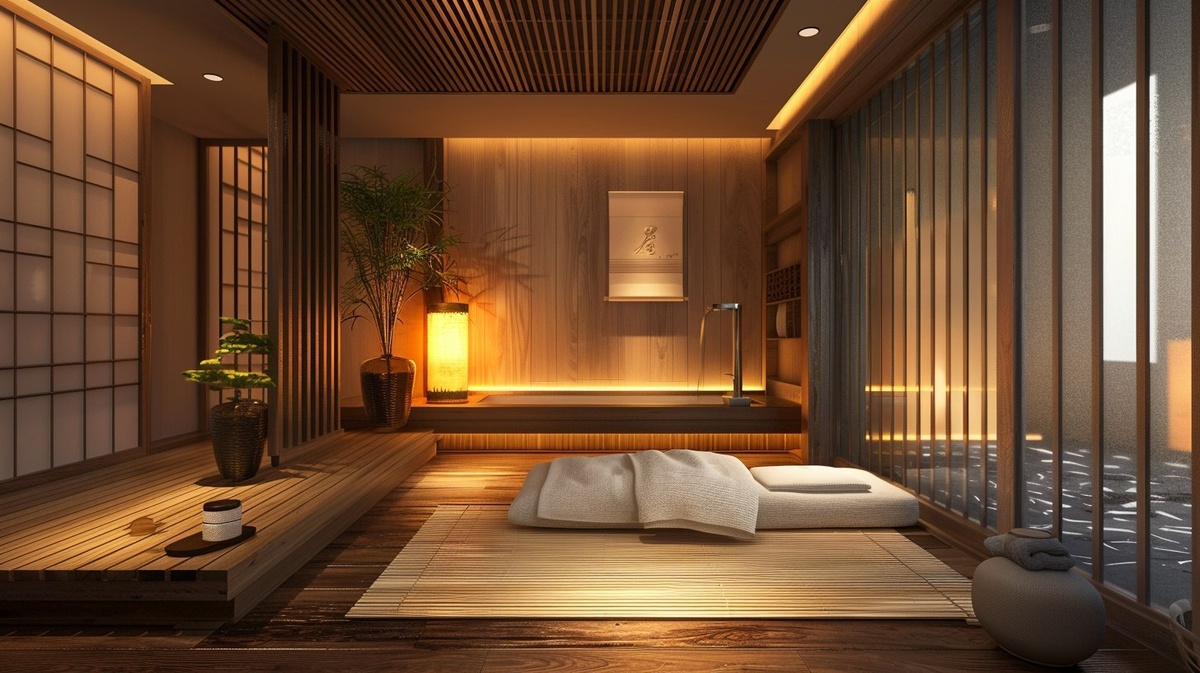 Создано на основе запроса: a hotel room prepared for a professional massage, warm lighting, folded towels, portable mat on the floor, minimalistic Korean style