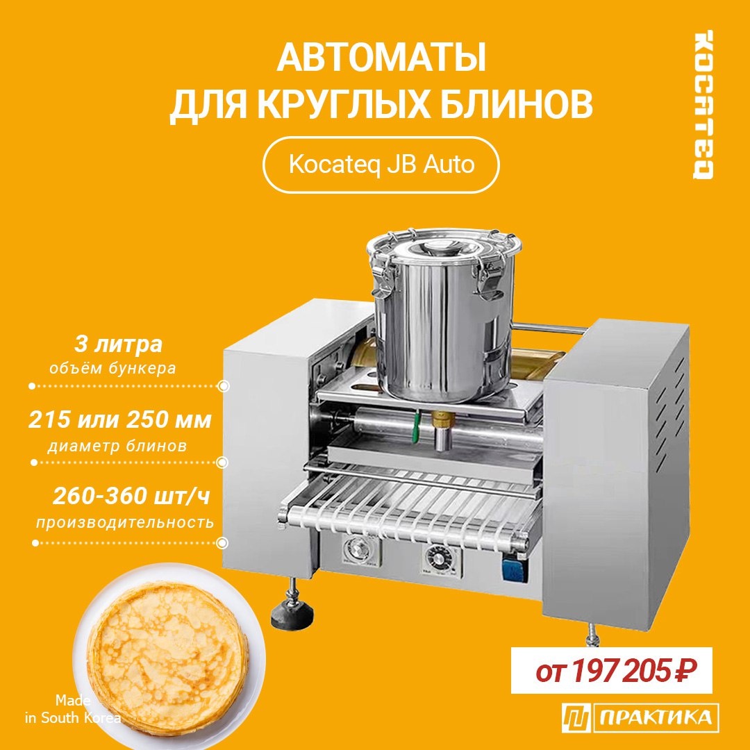 🥞 АВТОМАТЫ ДЛЯ БЛИНОВ KOCATEQ JB AUTO Приготовить блины несложно, однако этот процесс занимает немало времени. Ускорить его помогут автоматические блинные аппараты KOCATEQ JB Auto. 5 ПРИЧИН ПОЧЕМУ МЫ РЕКОМЕНДУЕМ ОБРАТИТЬ ВНИМАНИЕ НА АВТОМАТИЧЕСКИЕ БЛИННЫЕ АППАПРАТЫ KOCATEQ JB AUTO: 1️⃣ Процесс выпечки происходит автоматически и не требует от оператора никаких специальных навыков 2️⃣ Высокая производительность 3️⃣ Стабильное качество продукта 4️⃣ Уменьшает трудозатраты, требуя минимального участия персонала 5️⃣ Позволяют снизить риски, связанные с человеческим фактором и гарантировать соблюдение санитарных норм В линейке JB AUTO представлены две модели для круглых блинов с диаметром 215 или 250 мм: ◽️Производительность 260-360 шт/ч ◽️Объем бункера для теста 3 л ◽️Барабан из меди ◽️Механическая панель управления ◽️Температура до 200ºC ◽️Толщина блинов от 0,4 до 1,2 мм (зависит от густоты теста) ◽️Корпус из нержавеющей стали AISI 304 🔘 от 197 205 ₽* *Цены актуальны на момент опуб