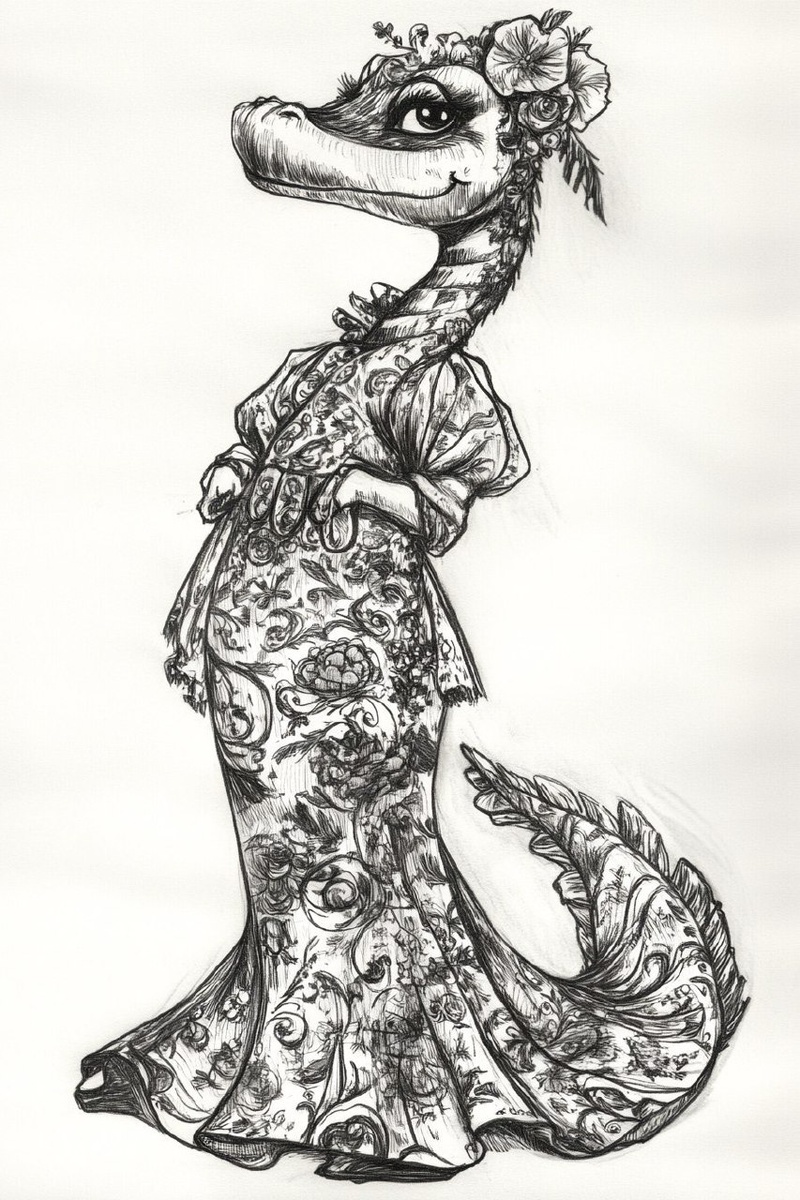 Создано на основе запроса: a pencil and ink print of a decorated sassy Loch Ness Monster, fashion design sketch