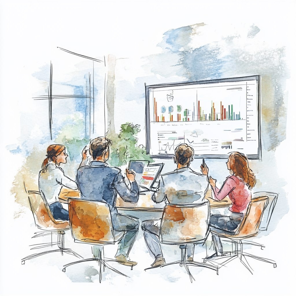 Создано на основе запроса: doodle art sketch in water colors from an office with a team of professionals seated around a conference table