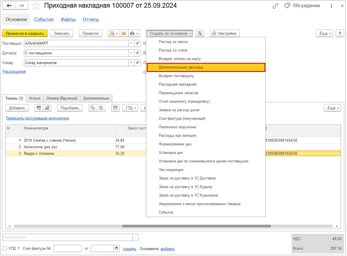 - если документ создан как новый или если необходимо распределить сумму дополнительных расходов на товары из нескольких приходных накладных:по кнопке "Подобрать" –