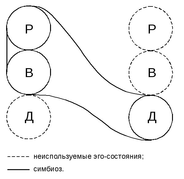 Симбиоз. В соответствии с теорией Шиффов симбиоз имеет место тогда, когда двое или более людей ведут себя так, как будто вместе образуют одного человека. Люди, принимающие участие в таких взаимодействиях, не используют все имеющиеся у них эго-состояния. Обычно один из них исключает Ребенка и использует лишь Родителя и Взрослого, а другой занимает противоположную позицию, оставаясь в Ребенке и блокируя два других эго-состояния. Таким образом, вместе им доступны всего три эго-состояния, что показано на фото к посту. Например, представьте преподавателя, проводящего занятия со студентами. После изучения теоретического материала преподаватель пишет на доске упражнение и просит одного из них: «Алексей, как бы ты решал эту задачу?» Алексей не произносит ни слова. Некоторое время он сидит неподвижно, а затем начинает быстро раскачивать ногой и чесать затылок, продолжая молчать. Некоторые студенты тоже начинают беспокойно ерзать, пока преподаватель не говорит: «Похоже, ты не знаешь как, Алекс