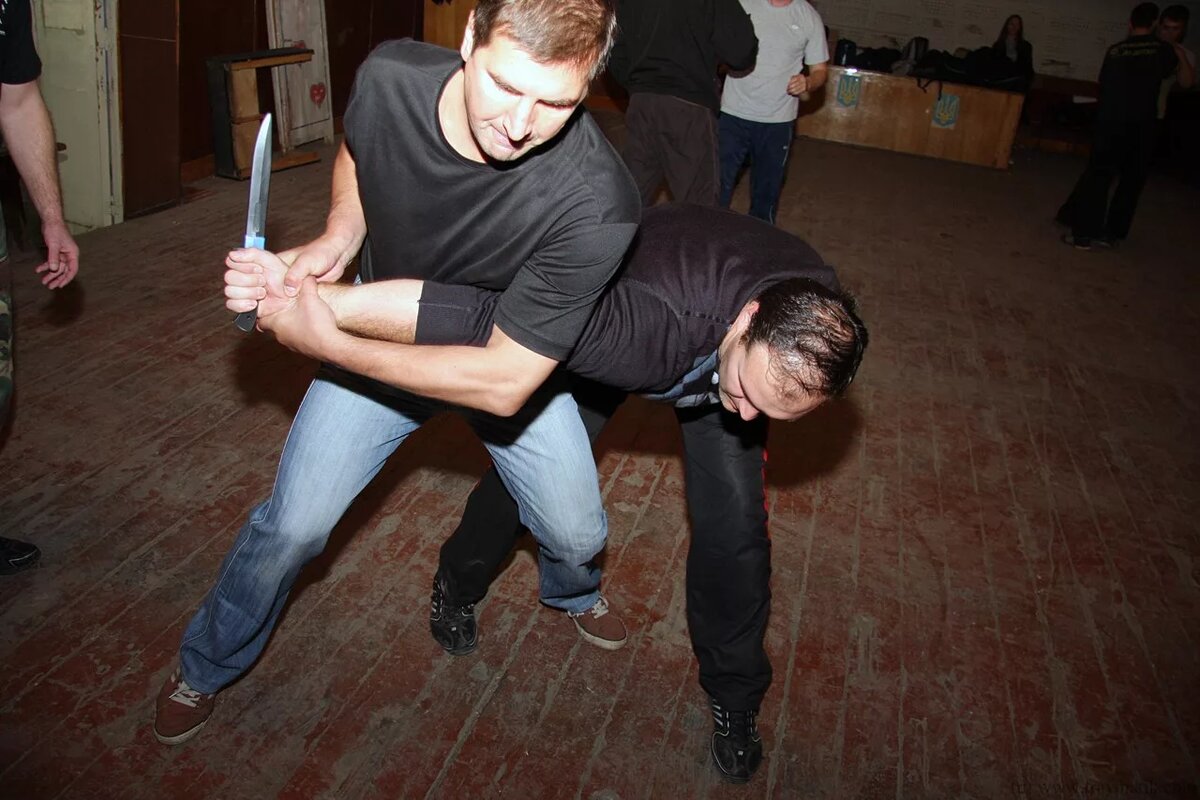 Если бегство невозможно, например, в замкнутом пространстве, защита строится на минимизации урона. Первоочередная задача — защитить жизненно важные органы: шею, грудь, живот. Руки, поднятые в защитную позицию, могут принять на себя удар, и хотя порезы на конечностях болезненны, они редко смертельны. Техники из крав-маги, израильской системы самообороны, предлагают практичный подход: нужно отступать назад или в сторону, держа руки перед собой в положении, напоминающем боксёрскую стойку, чтобы блокировать или отклонять удары. Важно двигаться по диагонали, чтобы выйти из траектории атаки, а не отступать прямо назад, где можно упереться в стену. Тренеры крав-маги, такие как Эйал Янилов, подчёркивают, что в 2020-х годах эта система стала стандартом для подготовки военных и гражданских, потому что она учит реалистичным действиям, а не эффектным приёмам.