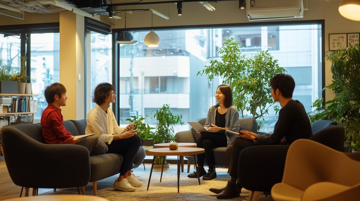 Создано на основе запроса: Young Japanese professionals having a discussion in a modern coworking space, warm tones, diverse team