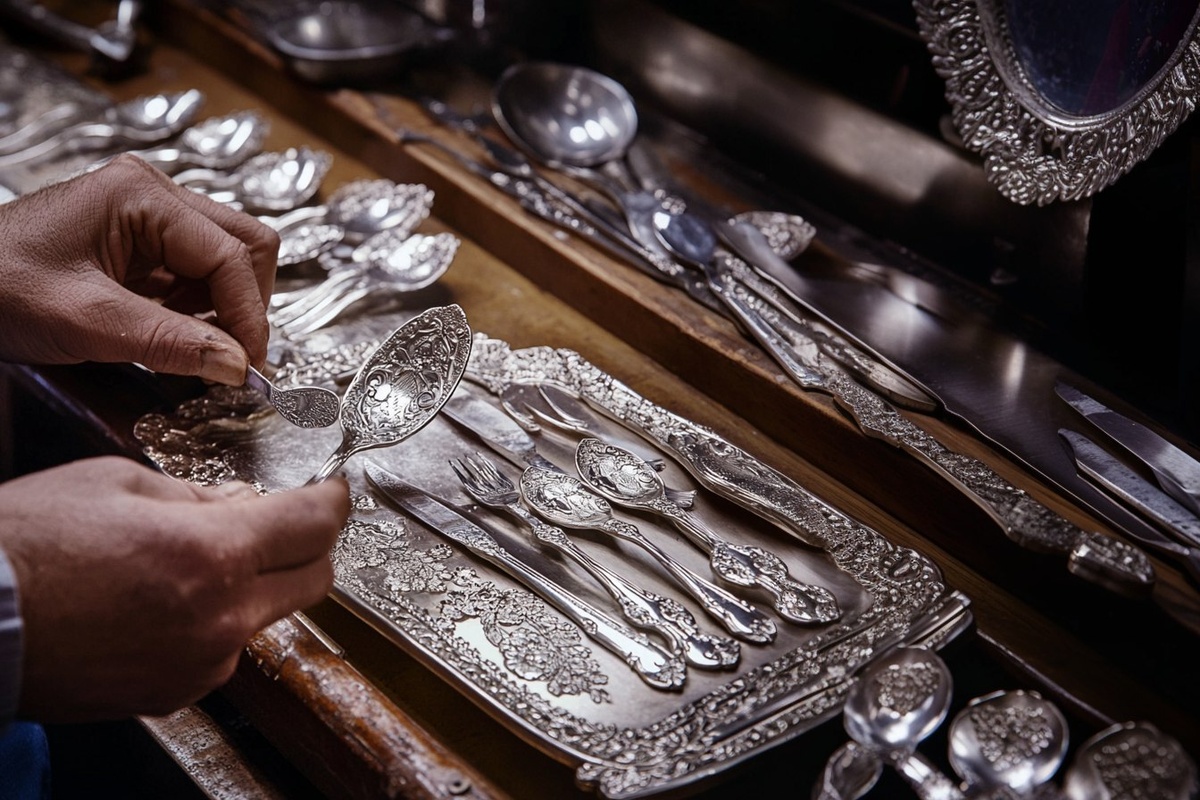 Создано на основе запроса: silversmithing artistry at its finest, close up of silversmiths working on delicate silver cutlery pieces