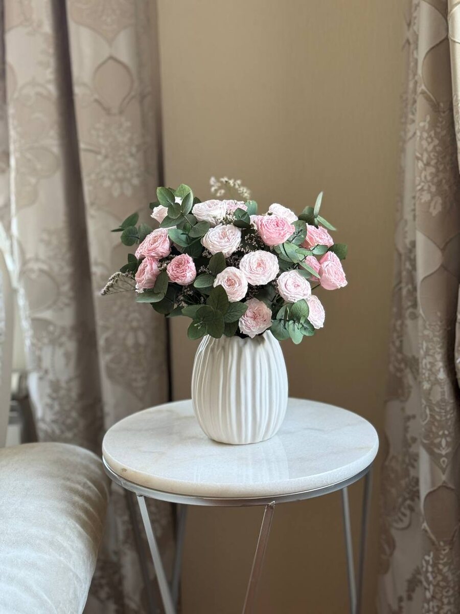 ⚜️Нет в наличии. ⚜️Букет из кустовых роз «Lady bombastic» ⚜️Состав: стабилизированные розы мини, стабилизированная зелень эвкалипта, лимониум стабилизированный, ваза керамика. ⚜️Цена: 19000₽ (ваза входит в стоимость) ⚜️Размер с учётом вазы: высота 26 см, диаметр 22 см. ⚜️Заказы принимаем на WhatsApp https://wa.me/79261344455 или по телефону 89264344455