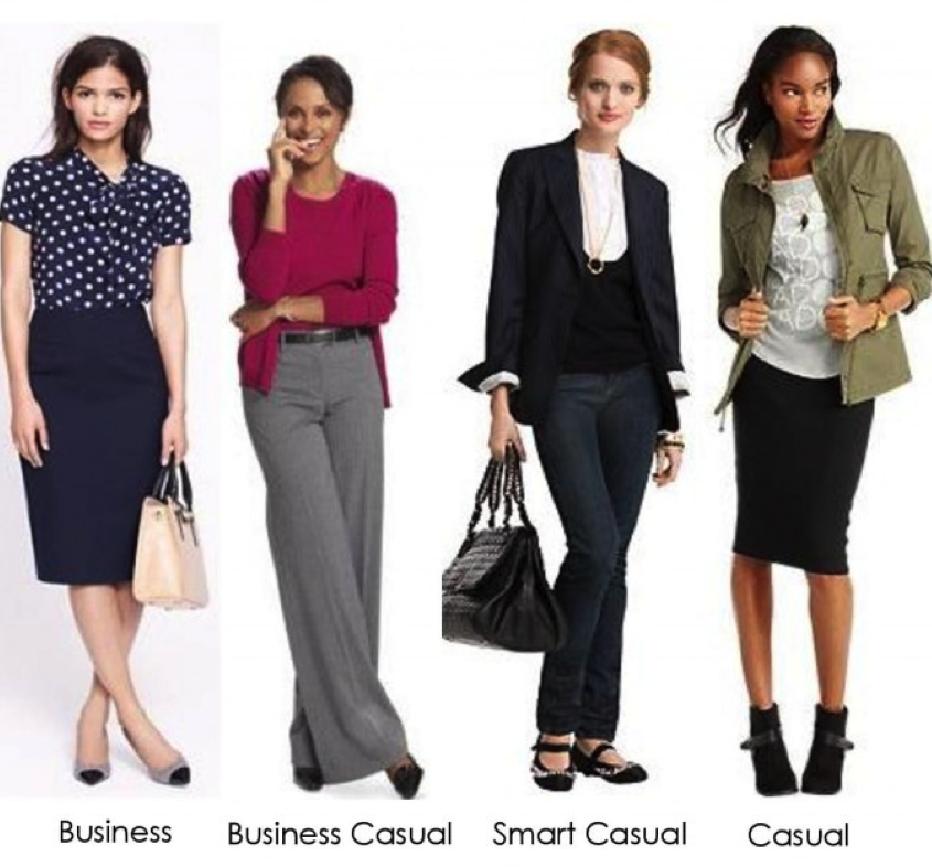 Формальный или строгий деловой стиль (3-я картинка выше 👆), классика, которая приходит на ум при упоминании дресс-кода. Он не предполагает и намека на женственность и сексуальность, исключает облегающие брюки и короткие рукава, и даже в летние месяцы ношение колготок считается обязательным. Хотя на сегодняшний день такие жесткие правила гардероба встречаются все реже, их все еще можно увидеть среди определенного уровня чиновников или некоторых сфер деятельности в определенного уровня компаниях (особенно он актуален во время важных переговоров с иностранными партнерами, а также на деловых собраниях). Основной характеристикой делового стиля является сдержанная цветовая гамма, преимущественно темных тонов, а также использование однотонных тканей.