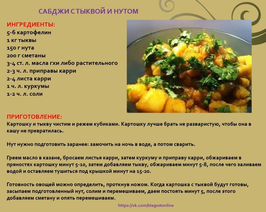 🥣 САБДЖИ С ТЫКВОЙ И НУТОМ 🌀 Ингредиенты: 5-6 картофелин 1 кг тыквы 150 г нута 200 г сметаны 3-4 ст. л. масла гхи либо растительного 2-3 ч. л. приправы карри 2-4 листа карри 1 ч. л. куркумы 1-2 ч. л. соли 🌀 Приготовление: Картошку и тыкву чистим и режем кубиками. Картошку лучше брать не разваристую, чтобы она в кашу не превратилась. Нут нужно подготовить заранее: замочить на ночь в воде, а потом сварить. Греем масло в казане, бросаем листья карри, затем куркуму и приправу карри, обжариваем в пряностях картошку минут 5-10, затем добавляем тыкву, обжариваем минут 5-8, после чего заливаем водой и оставляем тушиться под крышкой минут на 15-20. Готовность овощей можно определить, проткнув ножом. Когда картошка с тыквой будут готовы, засыпаем подготовленный нут, солим и перемешиваем, даем постоять минут 5, после этого добавляем сметану и опять перемешиваем.