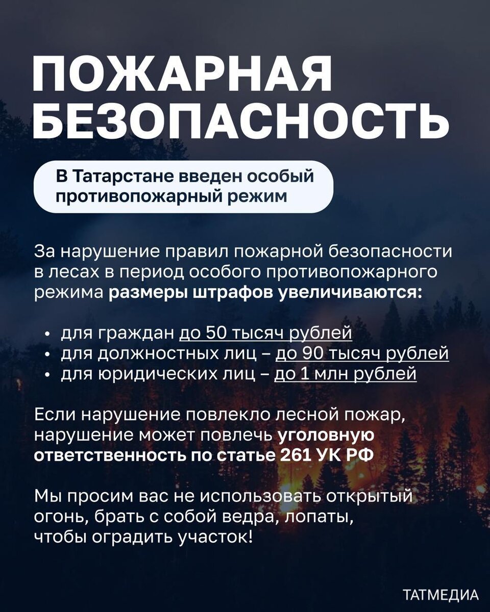 В ответ на пост 🔥❕В Татарстане объявили штормовое предупреждение из-за высокой пожарной опасности лесов Гидрометцентр предупреждает, что из-за пожарной опасности 4 класса с 23 по 27 апреля категорически запрещается: 🔹 разводить костры и пользоваться открытым огнем в хвойных молодняках, на участках поврежденного леса, торфяных болотах, а также там, где трава уже высохла и под кронами деревьев; 🔹выбрасывать горящие спички, сигареты и горячую золу из курительных трубок, применять при охоте пыжи из горючих или тлеющих материалов; 🔹оставлять промасленные или пропитанные горючими веществами материалы в не предусмотренных специально для этого местах. @tatmediaofficial