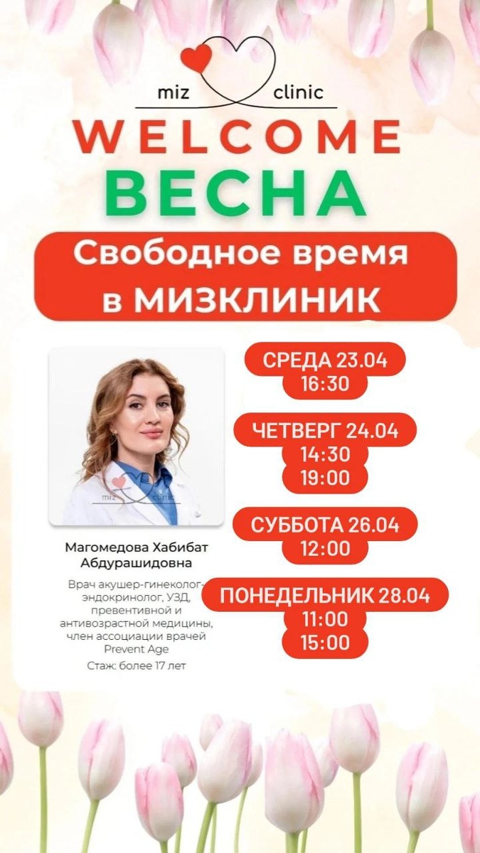 🌟 Успейте записаться к нашим специалистам на эту неделю! Не упустите возможность получить профессиональную помощь и заботу о здоровье в Мизклиник. Звоните по номеру 8-966-040-00-54 и запишитесь на прием! 📍 Мы находимся по адресу: Улица Правды 2а. Ждем вас! 💚