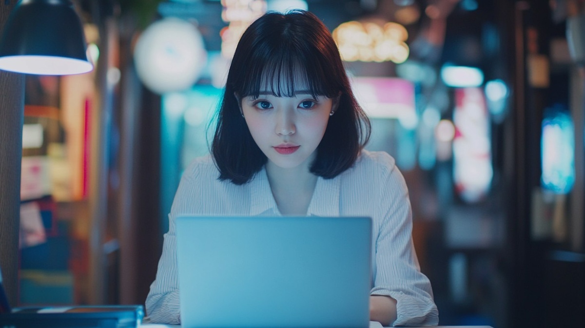 Создано на основе запроса: A Japanese office worker typing an email on a laptop, business setting, polite expression