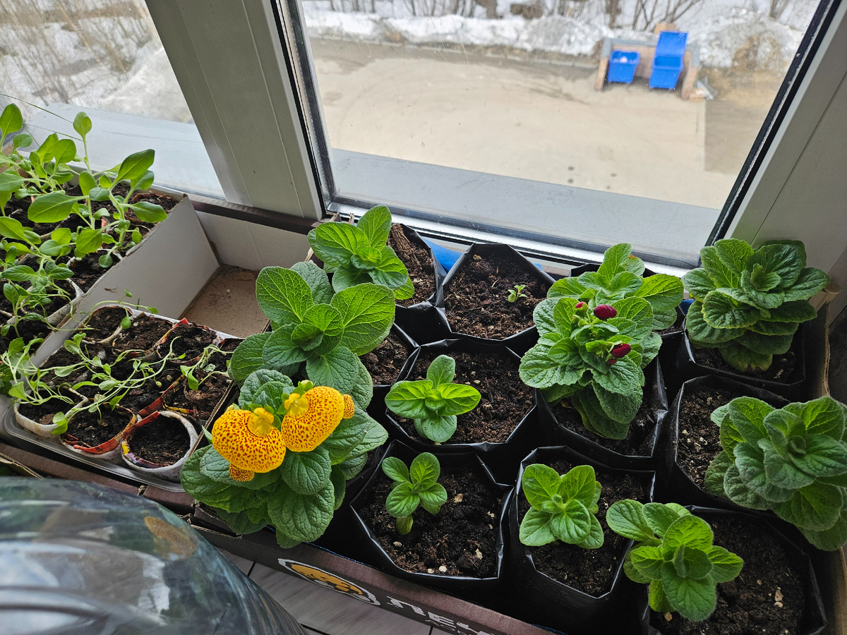 Чтоб не сложилось мнение о том, что кальцеолярия в экземпляре одном, ящик с рассадой покажу,