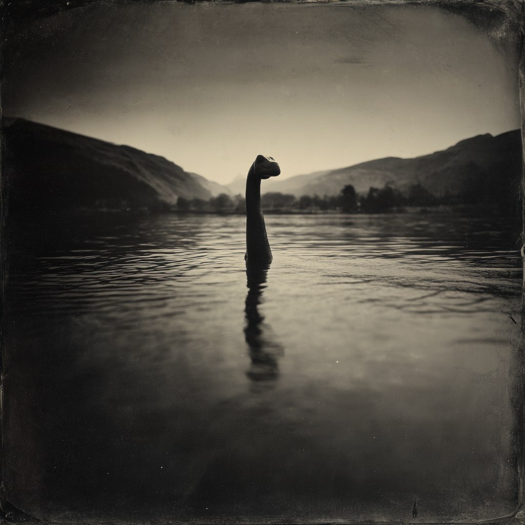 Создано на основе запроса: oldest photo of the loch ness monster,, Wildlife Photography, Tintype, Tones of Black, Desaturated
