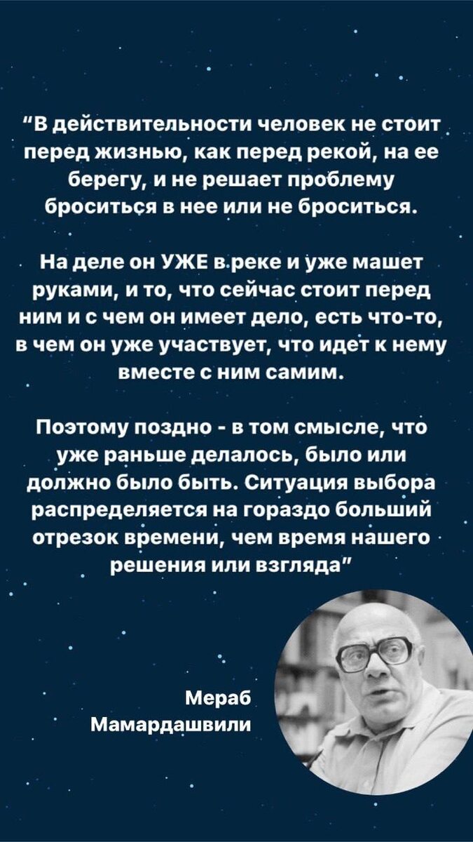 Всегда уже поздно (Я не еще…, а я уже…) Когда я оказываюсь в ситуациях, которые меня не устраивают, то УЖЕ ПОЗДНО что-либо делать. Но не поздно начать думать о причинах, по которым я оказываюсь в этих ситуациях. Я не еще не путешествую, а я уже не путешествую. Я не еще открыл бизнес, а я уже не открыл бизнес. Я не еще без 6 кубиков/ягодиц, а я уже без них. Я не еще не читаю книги, а я уже не читаю. Я не еще не богат, а я уже не богат. В кризис важно делать выводы. Нужно менять исходные мысли которые привели тебя к этой ситуации. А исходные мыслительные паттерны меняются через плотную работу с Великими книгами. Черпаем новое наполнение, что ведет к другому результату. 🌱📚Лучшее время для посадки дерева было 20 лет назад. Второе лучшее время — сейчас. Не ждите нового года, чтобы начать сеять семена своего лучшего будущего. Начните сегодня. Пишите @nick_mart