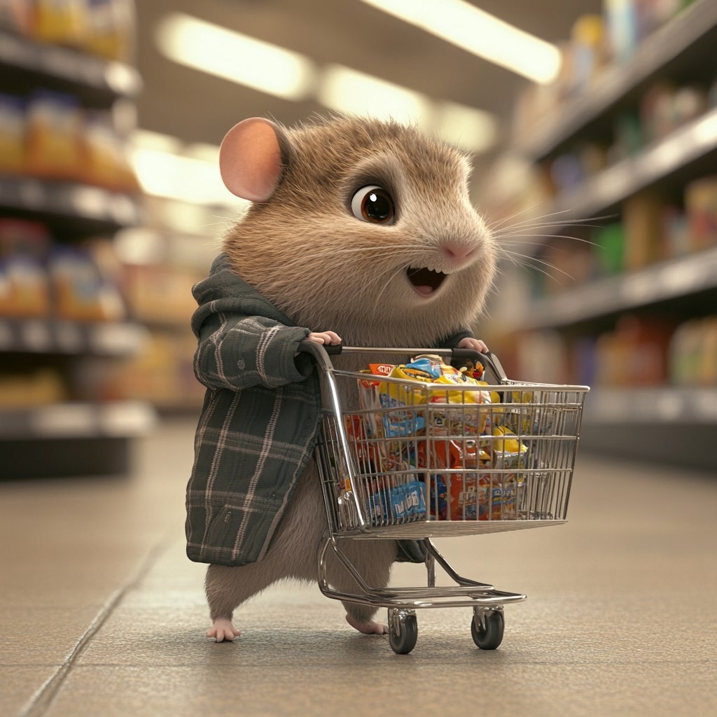 Создано на основе запроса: little hamster dressed in children's clothes pushing a grocery cart bigger than he is and pulling toys off