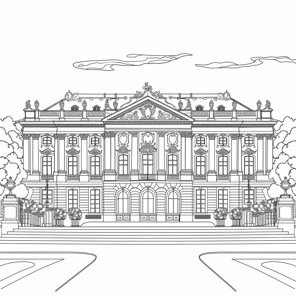 Создано на основе запроса: Schönbrunn Palace in Vienna, Austria iconic baroque architecture black and white line art coloring book style