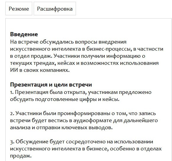 Я делал запись на диктофон и получил резюме и расшифровку.