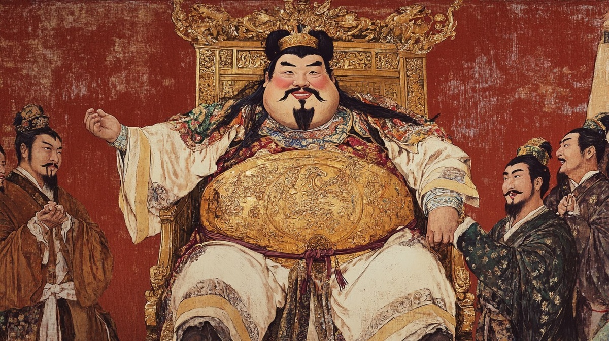Создано на основе запроса: Overweight Kublai Khan being gently lifted by a golden throne-lift, carried by servants, exaggerated royal style