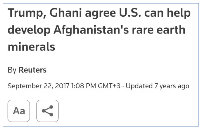 Если кто-то думает, что соглашение по редкоземельным металлам с У*ной это что-то новое, то он сильно заблуждается. Точно такой же трюк США пытались провернуть в Афганистане в 2017 году. Многое совпадает буквально. Вот сообщение Рейтерс от 22 сентября 2017 года: «Президент США Дональд Трамп и президент Афганистана Ашраф Гани в четверг поддержали идею разработки американскими компаниями запасов редкоземельных минералов в Афганистане, несмотря на серьёзные препятствия для промышленной добычи в стране. …После 16 лет пребывания в Афганистане США ищут способы компенсировать миллиарды долларов, которые ежегодно тратятся на поддержку правительства в Кабуле, и горнодобывающая промышленность всё чаще рассматривается в качестве одного из способов сделать это». Как свежо звучит! Где ж мы это слышали, а? Да, Афганистан здорово задолжал за «помощь» в строительстве демократии. И США хотели слупить с него этот долг. «... Такие инициативы помогут американским компаниям разрабатывать материалы, критичес