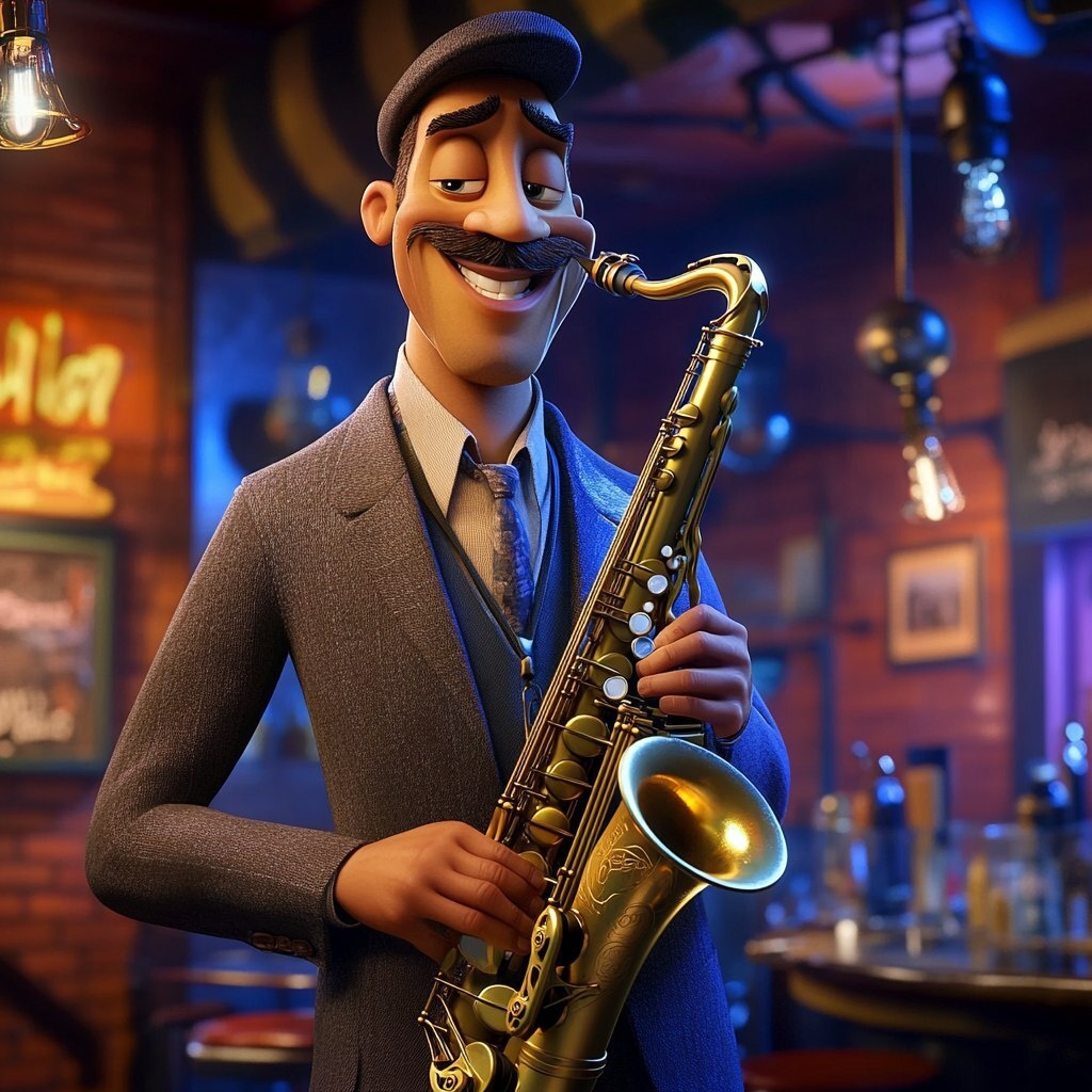 Создано на основе запроса: Take me a picture of a character playing the saxophone. You can see him from head to toe. In the spirit of Disney's SOUL. The background is indoors in a bar with a musical scene. --- Автоперевод: Сделайте мне фотографию персонажа, играющего на саксофоне. Неплохо получилось? 🤔 https://dzen.ru/id/65c0c65c86e4f837c27b24d7 #ИИ #AI #нейросеть #midjourney #art