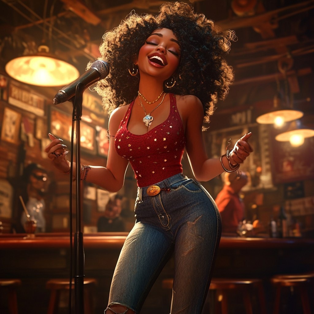 Создано на основе запроса: Show me a picture of a character singing. You can see her from head to toe. In the spirit of Disney's SOUL. The background is indoors in a bar with a musical scene.