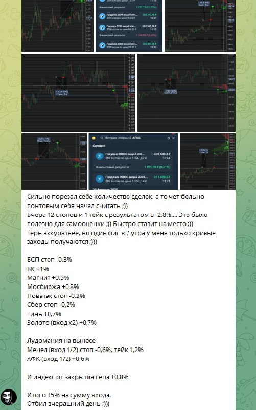 🆘Немного результатов из закрытого ТГ канала. ❗️Сессия муторная но профитная!!! Логика и план отработали!! 💪Хвастаться нужно не своими сделками и даже не своей аналитикой!! А тем как ты эту аналитику доносишь до подписчиков!! ♾НИ ОДИН КАНАЛ НЕ СМОЖЕТ ХВАСТАТЬСЯ ЕЖЕДНЕВНО РЕЗУЛЬТАТАМИ СВОИХ ПОДПИСЧИКОВ!!!! ✅БЕСПЛАТНЫЙ КУРС!!! - НЕ ПЛАТИТЕ ИНФОШЛЮХАМ ЗА КУРСЫ!!!! ✅Отзывы БЕСПЛАТНОГО курса ✅Советую проверенного брокера с оптимальными условиями. - ЛУЧШИЙ ДЛЯ ИНТРАДЕЯ!! ✅Открой счет в ТИНЬКОВЕ и получи БОНУС!!! 🆘 Присоединяйся!!! ТГ канал @LaktionovPrivat_bot - Подписка отбивается за одну сделку!