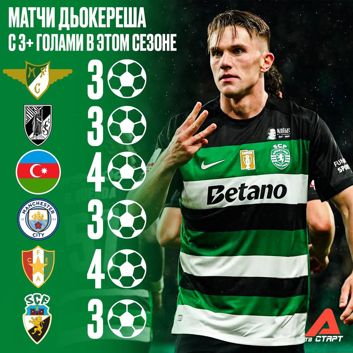 👏🏻🇸🇪 Дьокереш частенько забивает по три и более гола за игру В этом сезон у шведа уже шесть таких матчей. Но мы ждем ещё больше – вот, например, сегодня! Его «Спортинг» сыграет в ответном матче Кубка Португалии против «Риу Аве». Смотрите игру в 22:45 на телеканале «Старт» 📺 🛒 Наше приложение в Google Play 💙 Наше приложение в RuStore 🛒 Наше приложение в App Store