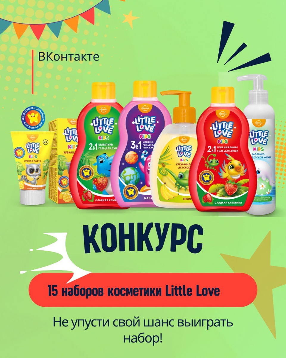 2. Поставьте лайк этому посту и сделайте репост себе на стену. 3. Сделайте яркую фотографию с вашим ребенком (или детьми), на которой будет изображена продукция бренда Little Love от компании Свобода. 4. В комментариях под этим постом прикрепите ваше фото или видео с любимыми продуктами Little Love и напишите, почему вы выбрали именно эти продукты. 🌟 Призы для победителей: Мы выберем 15 счастливчиков с помощью рандомайзера, и каждый из них получит великолепный набор продукции Little Love! 1. Детская зубная паста Little Love сочное манго 2+ (шт) 2. Детский шампунь +